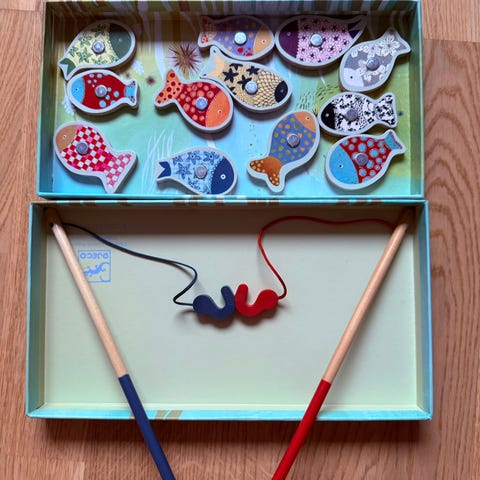 Djeco Fishing Game brettspill med fargerike fisker og fiskestang i tre. Passer for barn og fremmer motoriske ferdigheter og koordinasjon og forskjellige pusslespill til forskjellige aldre