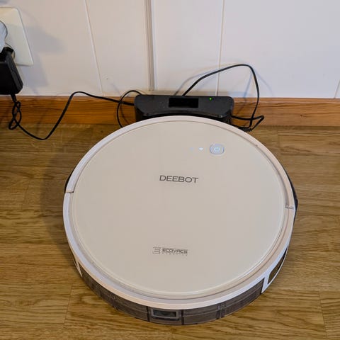Ecovacs Deebot Slim 2 robotstøvsuger i hvit farge. Følger meg utstyr for gulvvask også.