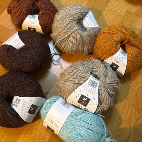 75 g helt ubrukt, resten har vært strikket og rekket opp, og deretter vindet opp til nøste.