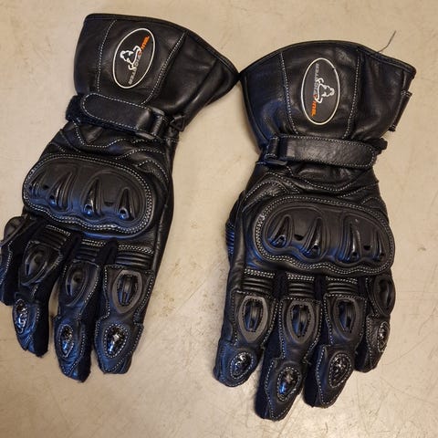 Kjørehansker til MC (eller moped, ATV). Usikker på om datter noen gang brukte de, i så fall bare et par ganger.