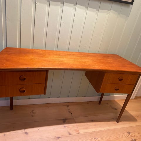 Mål, bredde 104 cm, dybde 56 cm, høyde bak 98 cm. Det er noen skraper på bordplata som eventuelt så må pusses ned. Er i teak. Kan prøve å skru den fra hverandre hvis den skal sendes :)