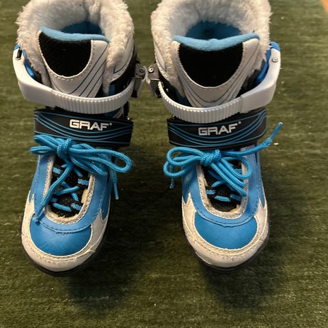 Graf skøyter farge blå/sort/hvit str 39-42 (du regulerer str selv etter behov). Kun prøvd forsiktig en gang, fremstår som nye. Selges kr 400