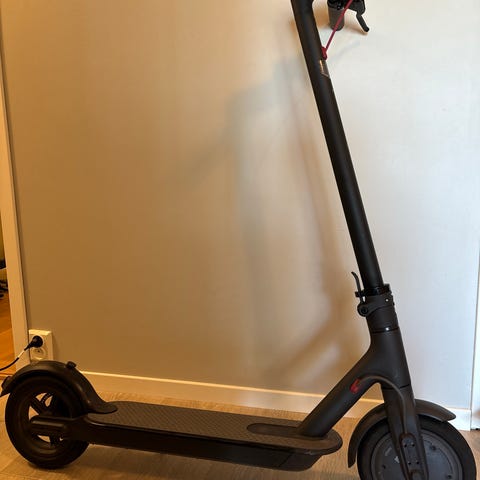 Xiaomi Mi Electric Scooter i svart farge. Elektrisk sparkesykkel med sammenleggbar ramme, LED-display for hastighet og batteristatus, og håndbrems. Egnet for voksne brukere og urbane transportbehov.