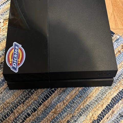 Sony Playstation 4 spillkonsoll med tilhørende kontroller. Konsollen er svart og designet for hjemmeunderholdning og spill.