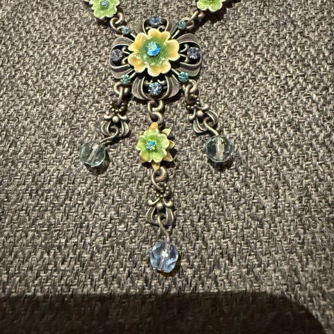 Dette smykkesettet er fra merket Pilgrim. Det består av et matchende halskjede og armbånd med et blomstermotiv og turkise eller blågrønne steiner. Veldig vakker smykkesett.Smykkene har en vintage eller oksidert metallfinish, som er typisk for eldre Pilgrim-design.
