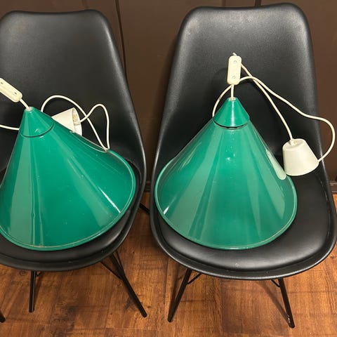 Selger en fin klassisk biljardlampe i messing med grønne lampeskjermer. Selges da vi har solgt biljardbordet.