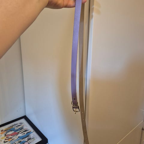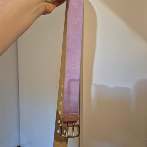 Dame flettebelte i rosa skinn med spenne i metall. Belte har hull for justering og flettet design. Lengde 100 cm. Forlengelse på ca 20 cm følger med.