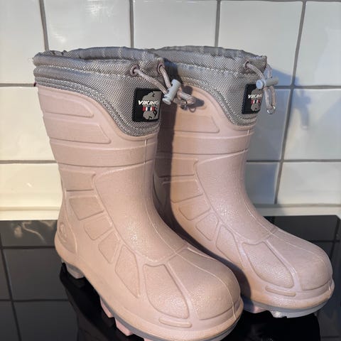 Viking barne støvler i størrelse 38, designet for jenter. Støvlene er rosa og laget av slitesterkt materiale med mønster på yttersålen for godt grep. Egnet for utendørs bruk.
