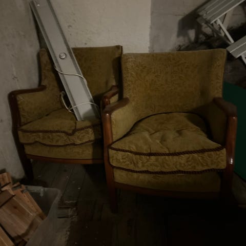 2 lenestoler i rødt skinn gis bort. En av stolene har en rift på armlenet, ellers hel og fin.