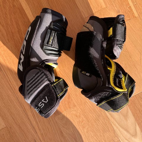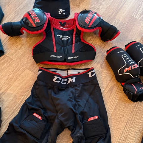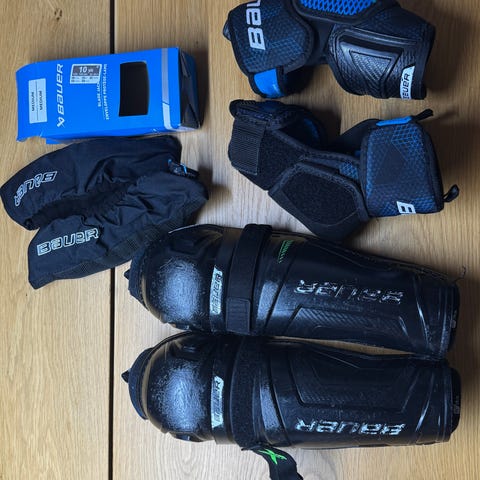 Bauer og CCM ishockeyutstyr bestående av hansker, benskinner, albuebeskyttere, skulderbeskyttere, hockeyhjelm, hockeybukser og hockeykøller. Utstyret er pent brukt.