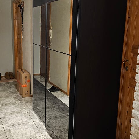 Kjøper står for demontering, bæring og transport. Skyvedørene er tunge og bør håndteres av to personer, og glass bør pakkes forsvarlig. Skyvedører, skinner og all innredning må tas av, og skapstammene anbefales demontert i deler for transport. Beregn ca. 2,5 timer (avhengig av erfaring) for demontering for to personer med vanlig verktøy.