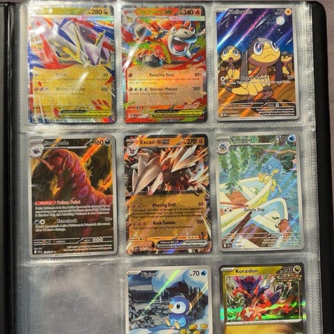 Pokémon samlekort med ild type motiver. Kortene viser ulike Pokémon-karakterer med tilhørende angrep og statistikker. Passer for samlere og spillere av Pokémon-kortspill.