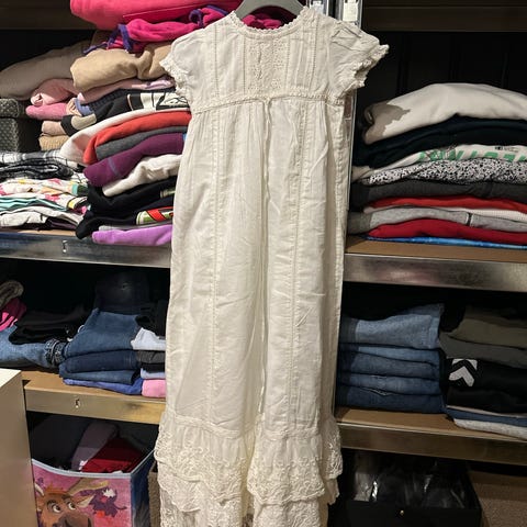 Vakker eldre dåpskjole – mønstret stoff og fine blondedetaljer