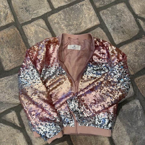 Jeg selger paljettjakke fra HM i størrelse 122. Jakken er laget av polyester og har glidelås foran. Jakken er lite brukt.