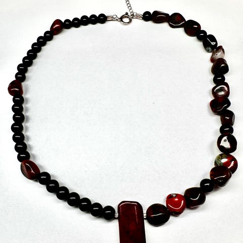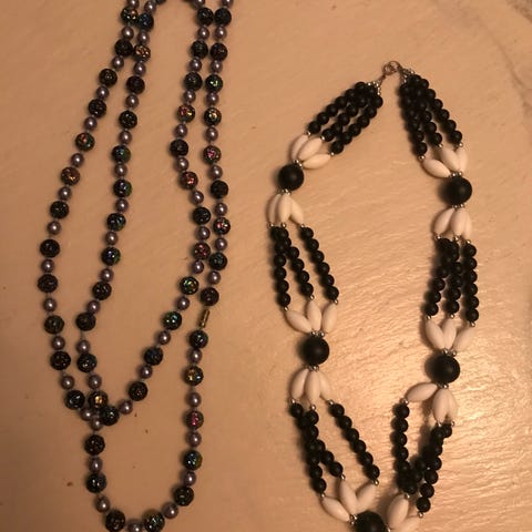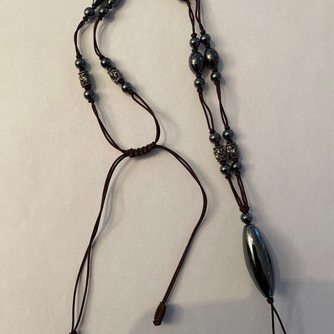 Selger flott halskjede laget av mange små perler i svart/sølv.