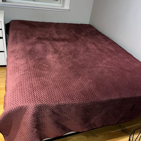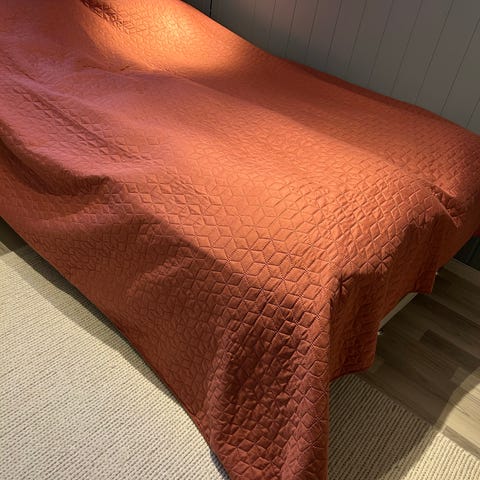 Sengen på bilde er 180x200 og teppet dekker godt på begge sider.