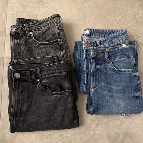 Selger en klespakke med 3 stk jeans. Den ene har dessverre et bruksmerke bake vist på bilde nr 6. det er ikke forsøkt vasket bort, vet ikke hva det er eller om det går bort. Resten har ikke bruksmerker. Slengte med den siste jeansen med bruksmerke for å få den bort og den er ikke lagt med i prisen, du kan evt kjøpe bare de to for 100 eller alle 3 for 100 ( den med bruksmerket er gratis)