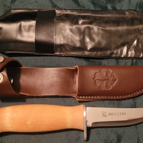 Fra samling selges ubrukt Brusletto Patriot. Dette er en kopi av kniven som Roald Amundsen hadde med til Sydpolen. Grep av masurbjerk med inskripsjon: Sydpolen 14-12-1911. Blad av rustfritt Sandvik 12C27 stål, lengde 9 cm.