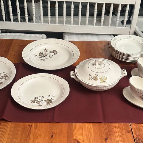 5 tallerkener fra Stavangerflint Epleblomst, normal bruksslitasje , den ene har ett strek i porselenet som ikke er spesielt pent . Ellers er de ok stand. Ingen skar eller krakeleringer som jeg kan finne.
