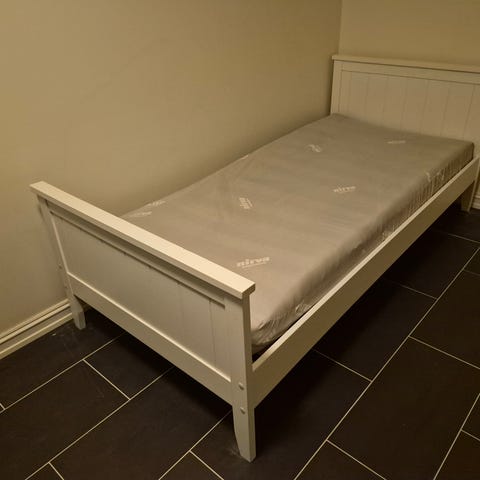 Sengen er kjøpt fra Jysk for 3 år siden, godt brukt. Størrelsen er 90×200. NB : madrass følger ikke med.