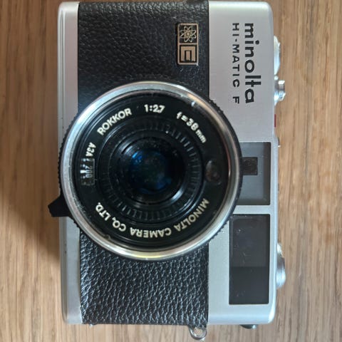 Minolta Hi-Matic F er en filmkamera med manuell fokus. Kameraet har en 38mm f/2,7 Rokkor Seiko linse og er utstyrt med en 46 mm UV-filter. Inkludert adaptere for LR44-batterier og en flettet håndleddsstropp. Kameraet er ca. 50 år gammelt og ser ut og fungerer som nytt.