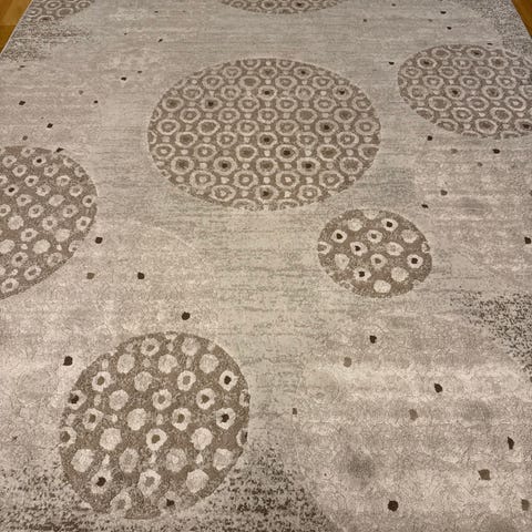 Lys beige teppe med blått mønster fra søstrene Grene. Noen år, men ligget under bord som ikke er mye brukt som sitte og spiseplass. Dyrefritt hjem. Nyvasket, kan vaskes i maskin. Må hentes