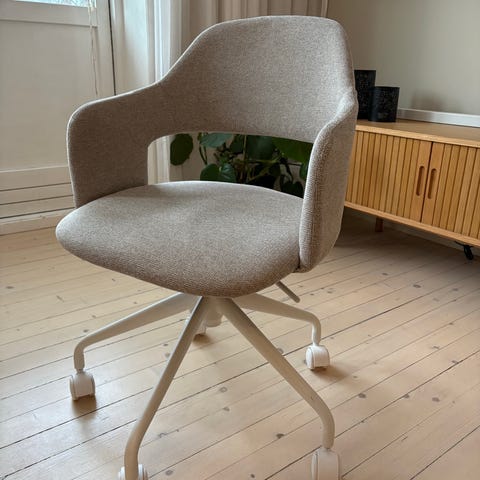 Lite brukt kontorstol som er kjøpt i 2024. Høy rygg på 66 cm. Sittehøyde pundet laveste er 48 cm og på det høyeste 62 cm. Bredden på setet er 66 cm. Ryggen har to innstillinger, en fast og en svingende.