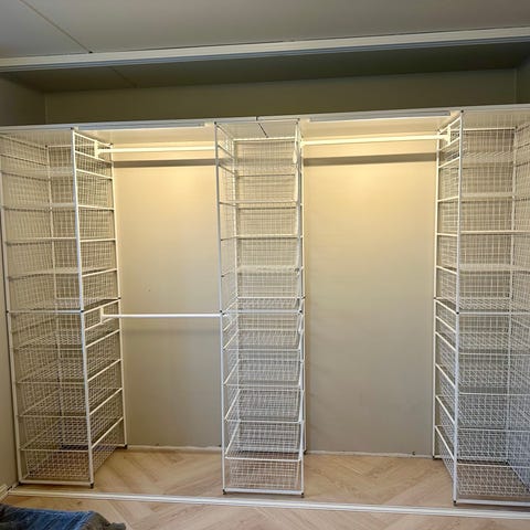 Komplett garderobesystem fra Elfa med stativ og kurver, som består av følgende: