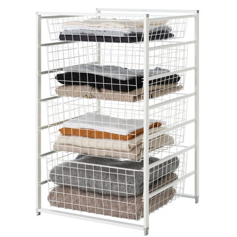 2 stk med høyde 175 cm, 1 stk med høyde 76 cm med topplate, se bildene. Totalt 13 kurver (2 store (h 28 cm) 10 medium (h 18 cm) og 1 liten (h 8 cm)), samt 7 skohyller. I tillegg medfølger det 8 stativklemmer og 2 stk holdere til garderobestang.