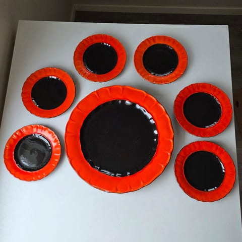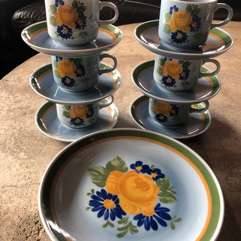Sukkerskålen har noen mørkere felter innvendig i bunnen, se bilde. Ellers ingen hakk, skår eller merker, lett krakelering på utsiden (se bilde), lokket er feilfritt. Den har stått i kjøkkenskapet i åresvis og er ikke blitt brukt siden min gamle slektning hadde dem. Den var stort sett til pynt da også, så den er i god stand med tanke på alder.