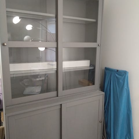Pent brukt IKEA HAVSTA oppbevaringsmøbel med vitrinedører med integrert belysning i den ene delen og skapdører i den andre.