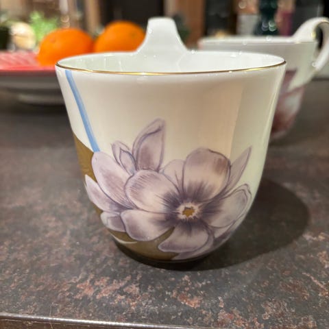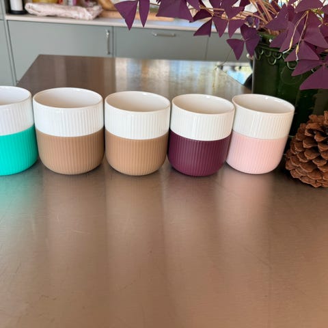 4 stk Lyngby porcelæn kopper selges for 100 kr stk. 2 hvite med hank. En blå med hank og en gul uten.