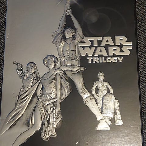 Star Wars Trilogy DVD-boks med filmene A New Hope, The Empire Strikes Back og Return of the Jedi. Inkluderer bonusmateriell. DVD-boksen har et omslag med karakterer og filmens titler på sidene.