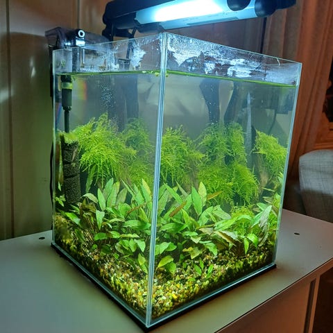 Akvarium med kampfisk, lys og levende planter. Her får du alt i et med en sunn og sterk hun-kjønn kampfisk. Passer til små fisk og akvatiske planter. Har en enkel og funksjonell design med klar glasskasse og integrert belysning.