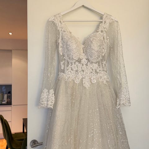 Dress bought from JJs house in champagne color for a wedding related event (but not the wedding). It is a gorgeous dress, but I am selling it since I will not rewear it. Worn once. Could easily be worn as a wedding dress, though it is off white and champagne.