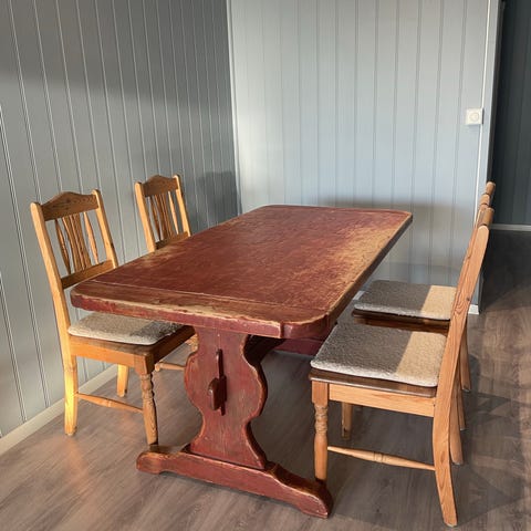 6 røde stoler ukjent merke. Med utskjæringer i rygg.
