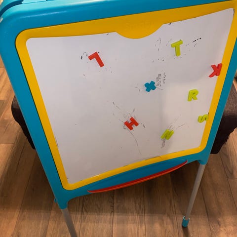 Dobbeltsidig staffeli fra Smoby med en magnetisk side og en side med krittavle. Magnetiske tall og bokstaver medfølger.