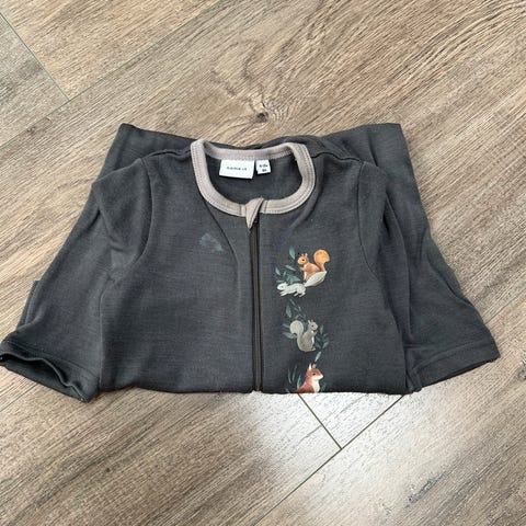 Name it Merinoull barnedrakt i brun farge, størrelse 80, designet for unisex barn. Laget av merinoull som gir varme og komfort. Drakten har lange ermer og bein, med glidelås foran for enkel påkledning. Dekorert med dyremotiver på forsiden.