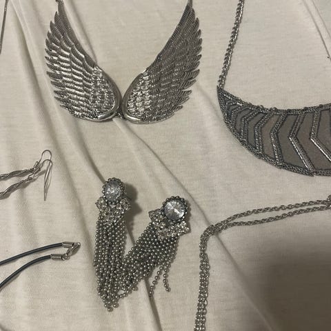 To av dem er like, men i ulik farge (sølv og gull). De er lange, med et stilig geometrisk anheng. Pent brukt et par ganger.
