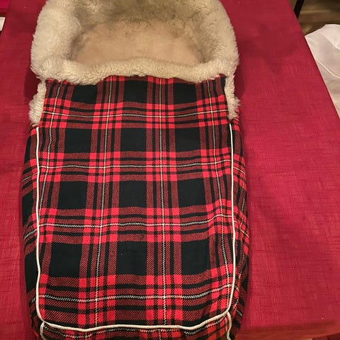 Selger denne fine babyposen/sovepose til vogn/pulk mm. Fin til barnehagen, hytta osv. Den har rutete ullstoff på utsiden i rødt og mørkegrønt. På innsiden deilig ull. Den er i svært god stand. Selges grunnet flytting. Denne er god og varm. Kan sendes. Lengde ca. 75 cm, bredde nederst ca 28 cm, ca. 36 cm bred i åpningen. Den har feste til vogn i ryggen og bærehank til oppheng. Klar til bruk i vinterdagene. Selges kr 500. Send melding i finn.