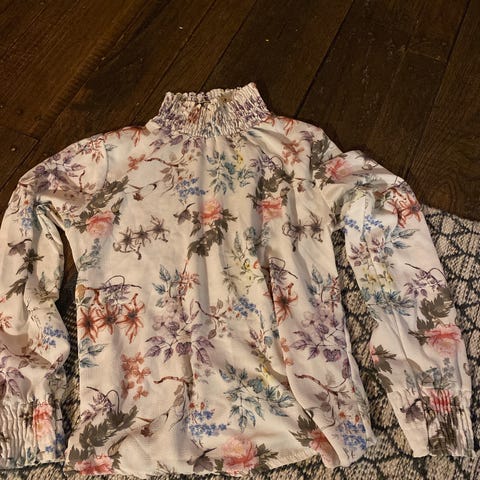 RAH Oslo Bluse i størrelse M. Blusen er rutete blå, hvit, grønn, gul, grå. 100 % bomull. Den har puffede ermer og en rund hals med rysjedetalj. Lukking med knapp bak i nakken, splitt i siden. Mål fra underarm til underarm: 52 cm, lengde foran: 50 cm og lengde bak: 61 cm