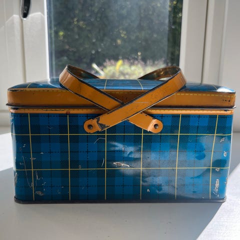 🟡 Vintage matboks i blikk – skolemotiv (1950–60-tallet)