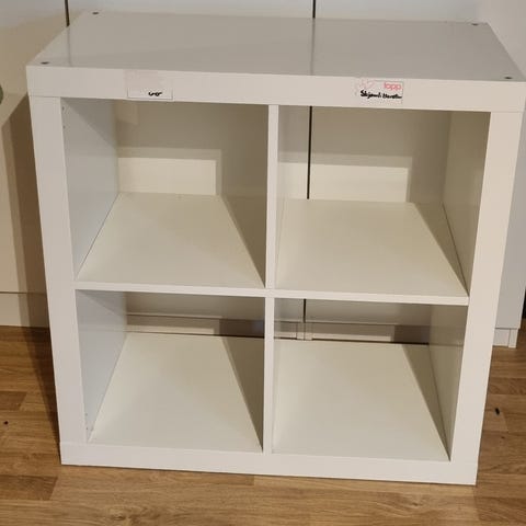 Godt brukt hvit Kallax-hylle fra IKEA. Se bilder for bruksslitasje. Ellers i god stand, stabil og solid.