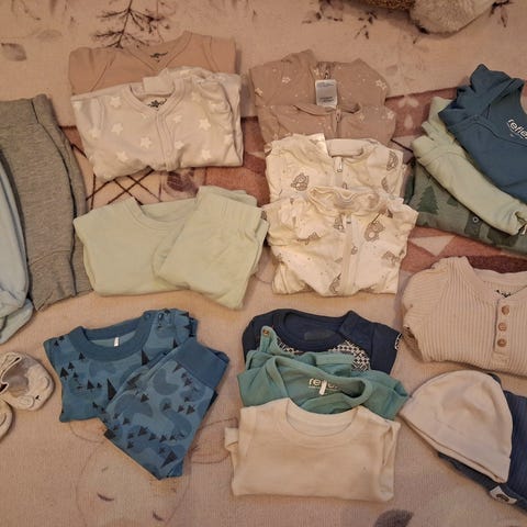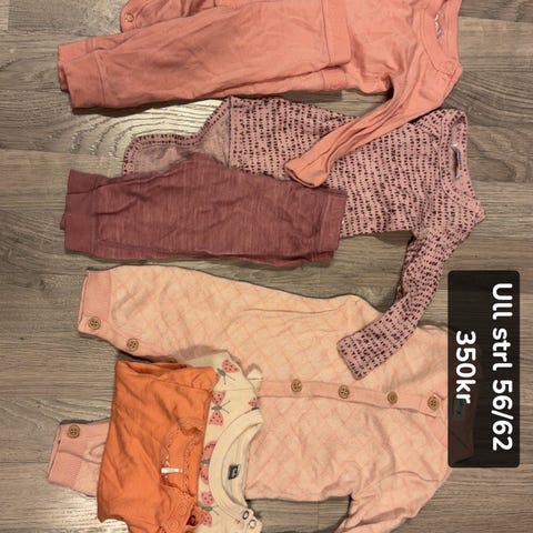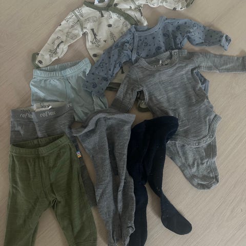 Ullklær- 2 sparkedrakter, 3 bodyer og 2 bukser