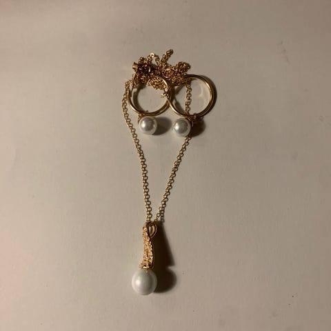Perlene er seed beads i gullfarger, endene er voks-perler og akryl-perle tredd med wire.