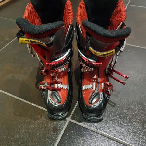 Head Dream 5 alpinstøvler for dame i størrelse 24. Støvlene er hvite med flere spenner for god tilpasning. Modellen har Tech Chart med Last TWP 1950cc/102 og Flex 70. Innvendig fôr er mykt og isolerende. Min datter bruker 37 og har 23 cm lange ben, men de ble for små til henne.