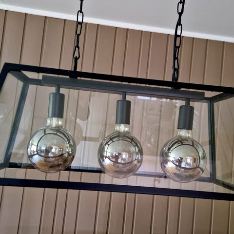 Dovre taklampe i glass og metall er en rustikk lampe med industrielt design, som passer godt til både hytte og hjem. Taklampen gir et lunt stemningslys med sine tre dimbare lyskilder. Hel og pen. Hentes på Nordstrand i Oslo eller ev Hafjell. Pris er inkl pærene; relativt nye dekorpærer fra North.