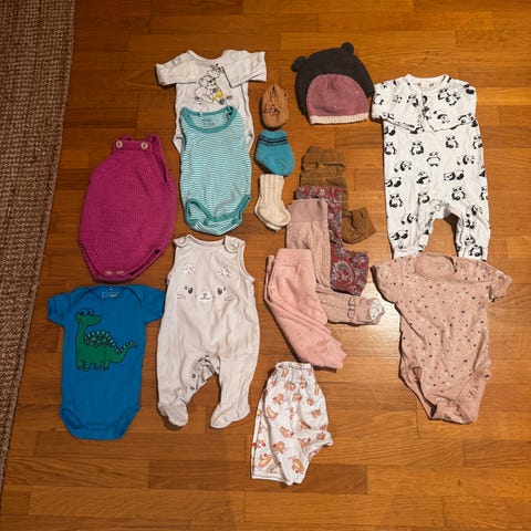 Størrelse 0-6 mnd. For det meste bomull, men en godt brukt ullbody og en ull balaclava, samt tre hjemmestrikkede ullsokker.
