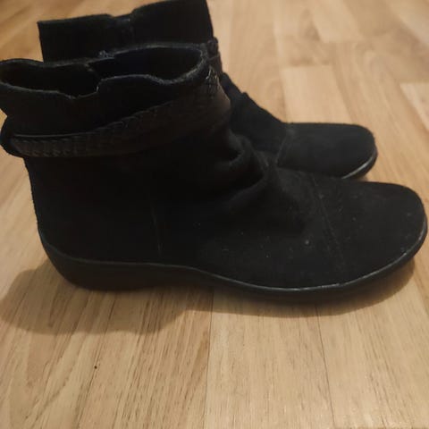 ECCO hæler i størrelse 39, blå farge. Skoene har en klassisk design med lukket tå og middels høy hæl. Materialet fremstår som semsket overflate. Egnet for formelle eller hverdagslige anledninger. Noen bruksmerker, men fortsatt pene.