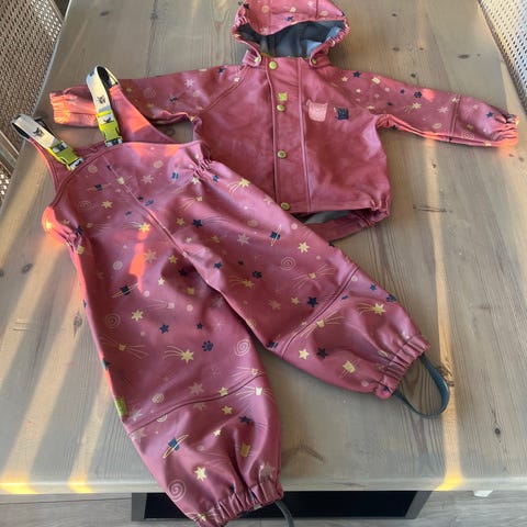 Flott regnsett fra Kattnakken i en herlig rosa farge. Helt og pent. Refleksstripen på ene armen er slitt bort. Hele fotstrikk.